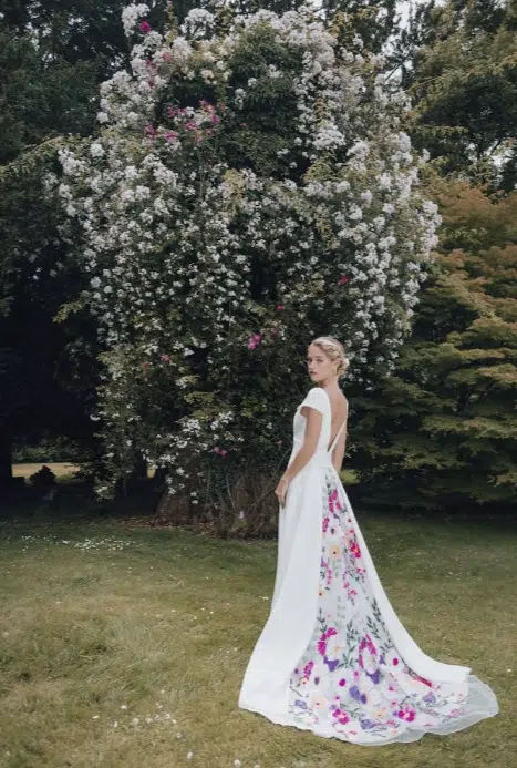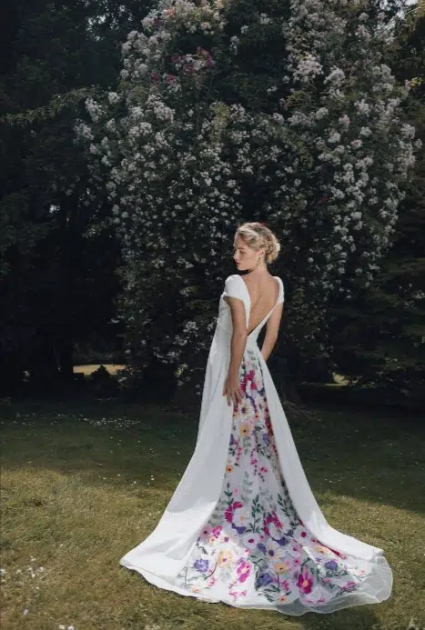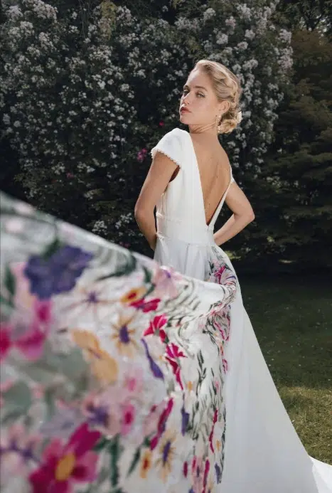 La robe Irène est une création modulable exceptionnelle, conçue pour les mariées en quête d’élégance et de praticité. Cette robe se distingue par sa traîne florale colorée, un véritable chef-d’œuvre orné de motifs naturels, qui peut être astucieusement refermée pour transformer la silhouette.Idéale pour briller lors de la cérémonie et danser librement pendant la réception, la robe Irène est confectionnée dans un tissu fluide et raffiné, garantissant confort et sophistication. Une pièce unique qui s’adapte à chaque moment de votre journée spéciale avec grâce et modernité.