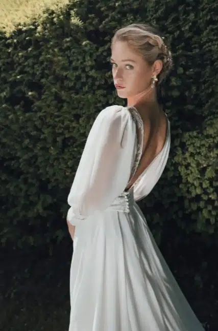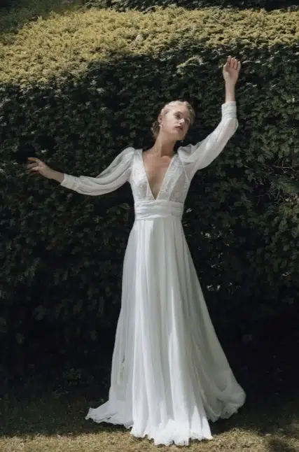 La robe Juliette d’Elsa Gary incarne la poésie et la légèreté chères à la maison française. Avec son décolleté plongeant en dentelle délicate, ses manches longues légèrement bouffantes et sa jupe fluide en mousseline, elle allie sensualité et romantisme naturel.
