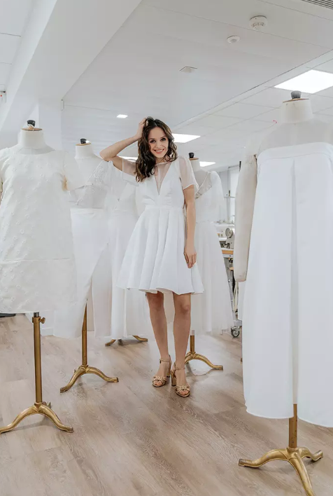 Raffinement et délicatesse définissent cette robe courte midi en satin duchesse, parfaite pour un mariage civil élégant. Ses manches légères en organza et son décolleté profond subtilement voilé apportent une touche de romantisme et de modernité.