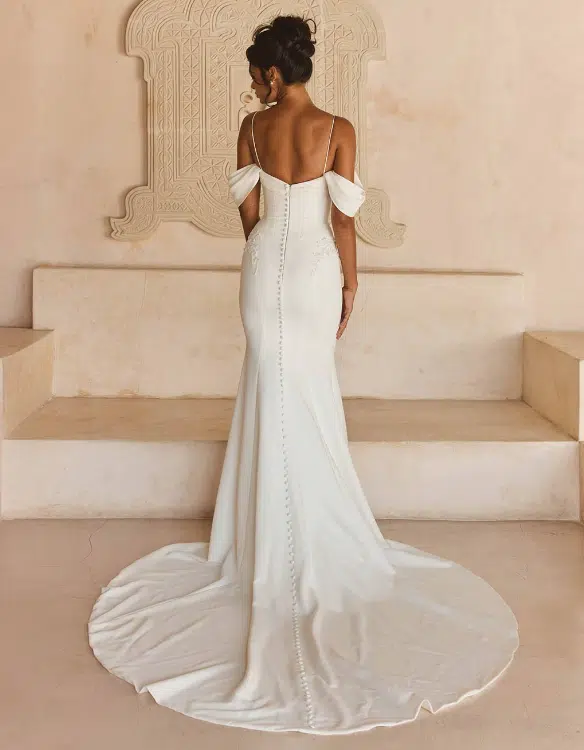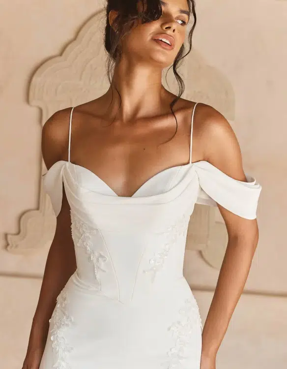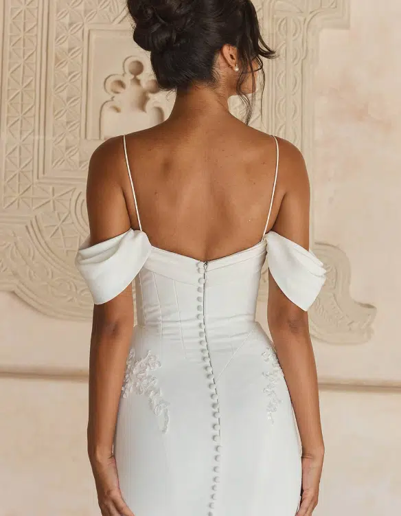 La robe Leo de Madi Lane incarne l’élégance minimaliste avec une touche sensuelle. Sa coupe sirène épouse délicatement les formes tout en offrant une silhouette élancée et moderne. Le bustier structuré à effet corset est sublimé par un col bénitier fluide, encadré de fines bretelles spaghetti et de manches tombantes détachables pour un effet romantique et aérien. Quelques délicates broderies florales viennent souligner les hanches et le corsage, apportant une subtilité raffinée à l’ensemble. Confectionnée dans un crêpe lisse et fluide, Leo séduit par sa simplicité sophistiquée, idéale pour une mariée contemporaine en quête de grâce et de pureté.