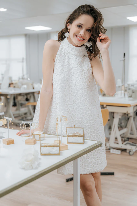 Cette robe courte pour mariage civil allie modernité et féminité. Avec sa coupe évasée et son col montant élégant, elle offre une allure chic et contemporaine. Les motifs floraux en dentelle ajoutent une touche romantique et délicate, idéale pour une cérémonie civile pleine de style.