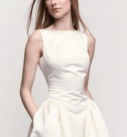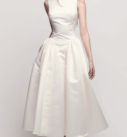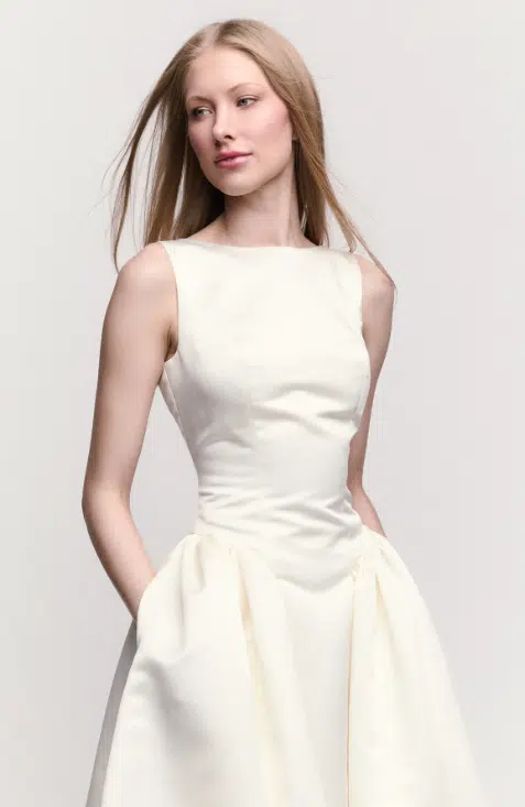 Son décolleté bateau apporte une touche sophistiquée et minimaliste, tandis que le corsage structuré souligne joliment la taille. La jupe midi évasée, au tombé impeccable, crée un équilibre parfait entre modernité et féminité, avec un esprit couture très affirmé.