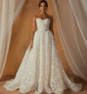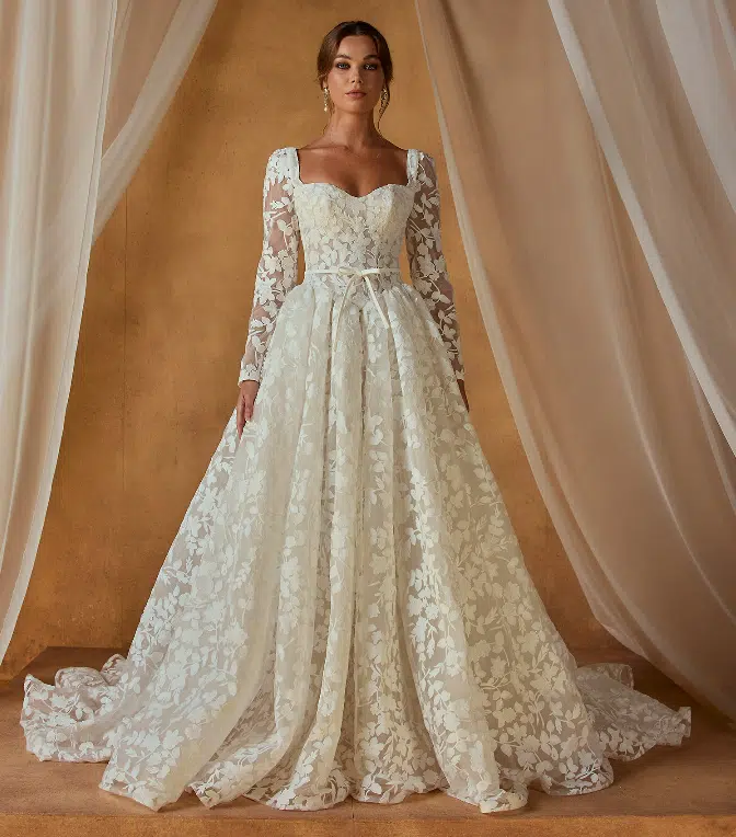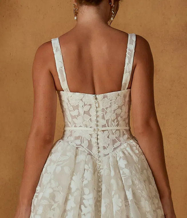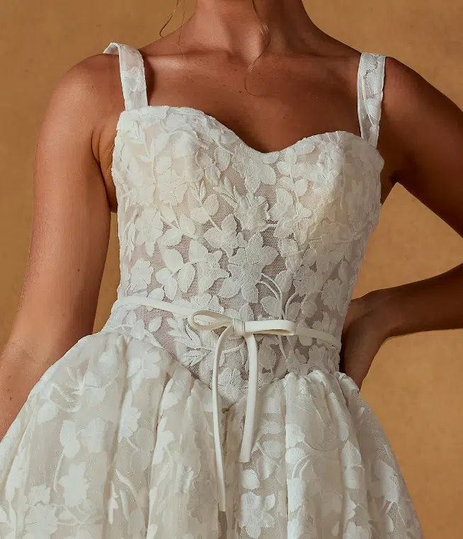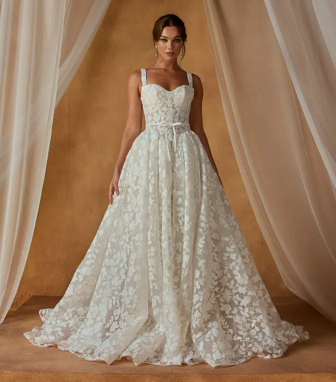 La robe Noble de Madi Lane est une robe de mariée 3-en-1 pensée pour les mariées modernes en quête de polyvalence. Son élégante base bustier en dentelle florale peut se porter de trois façons : en bustier structuré, avec bretelles délicates ou avec manches longues amovibles, offrant ainsi trois styles différents pour une seule robe.